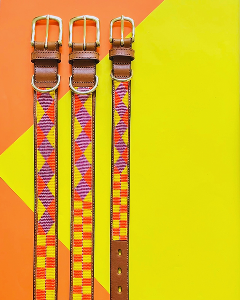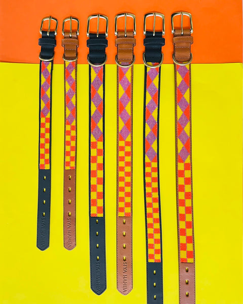 Our pet collars are handcrafted in Kwa-Zulu Natal, South Africa by local artisans. Ethically sourced glass beads are stitched to genuine leather and fastened by a brass buckle to ensure durability and authenticity. Each collar is unique and might differ slightly in design from these images.