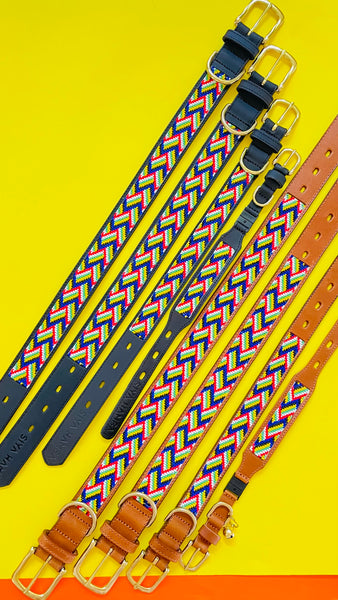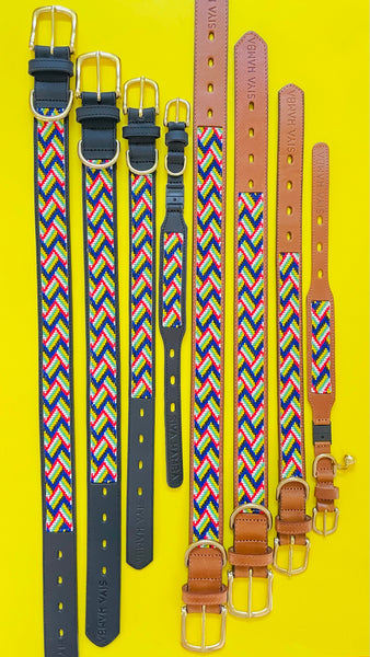 Our pet collars are handcrafted in Kwa-Zulu Natal, South Africa by local artisans. Ethically sourced glass beads are stitched to genuine leather and fastened by a brass buckle to ensure durability and authenticity. Each collar is unique and might differ slightly in design from these images.Â